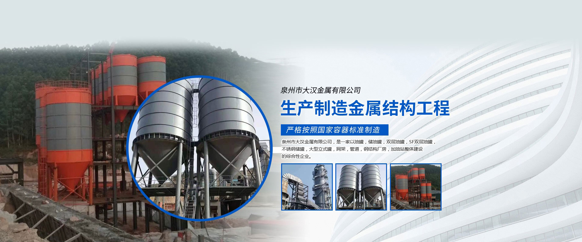 泉州市大漢金屬有限公司,是一家以油罐、儲(chǔ)油罐、雙層油罐、SF雙層油罐、不銹鋼儲(chǔ)罐、大型立式罐、網(wǎng)架、管道、鋼結(jié)構(gòu)廠房、加油站整體建設(shè)的綜合性企業(yè)。本公司以技術(shù)人員、施工經(jīng)驗(yàn)豐富的工程隊(duì)、自動(dòng)化設(shè)備、擁有鋼結(jié)構(gòu)建筑、螺栓球網(wǎng)架設(shè)計(jì)安裝技術(shù)力量,嚴(yán)格按照國(guó)家容器標(biāo)準(zhǔn)制造,是一家產(chǎn)品開(kāi)發(fā)并生產(chǎn)各種壓力容器和制造金屬結(jié)構(gòu)工程,化工石油工程安裝的大型企業(yè)。近多年來(lái),以質(zhì)量穩(wěn)定、客戶至上、信譽(yù)為本,以科技求發(fā)展,贏得廣大客戶支持與信賴。